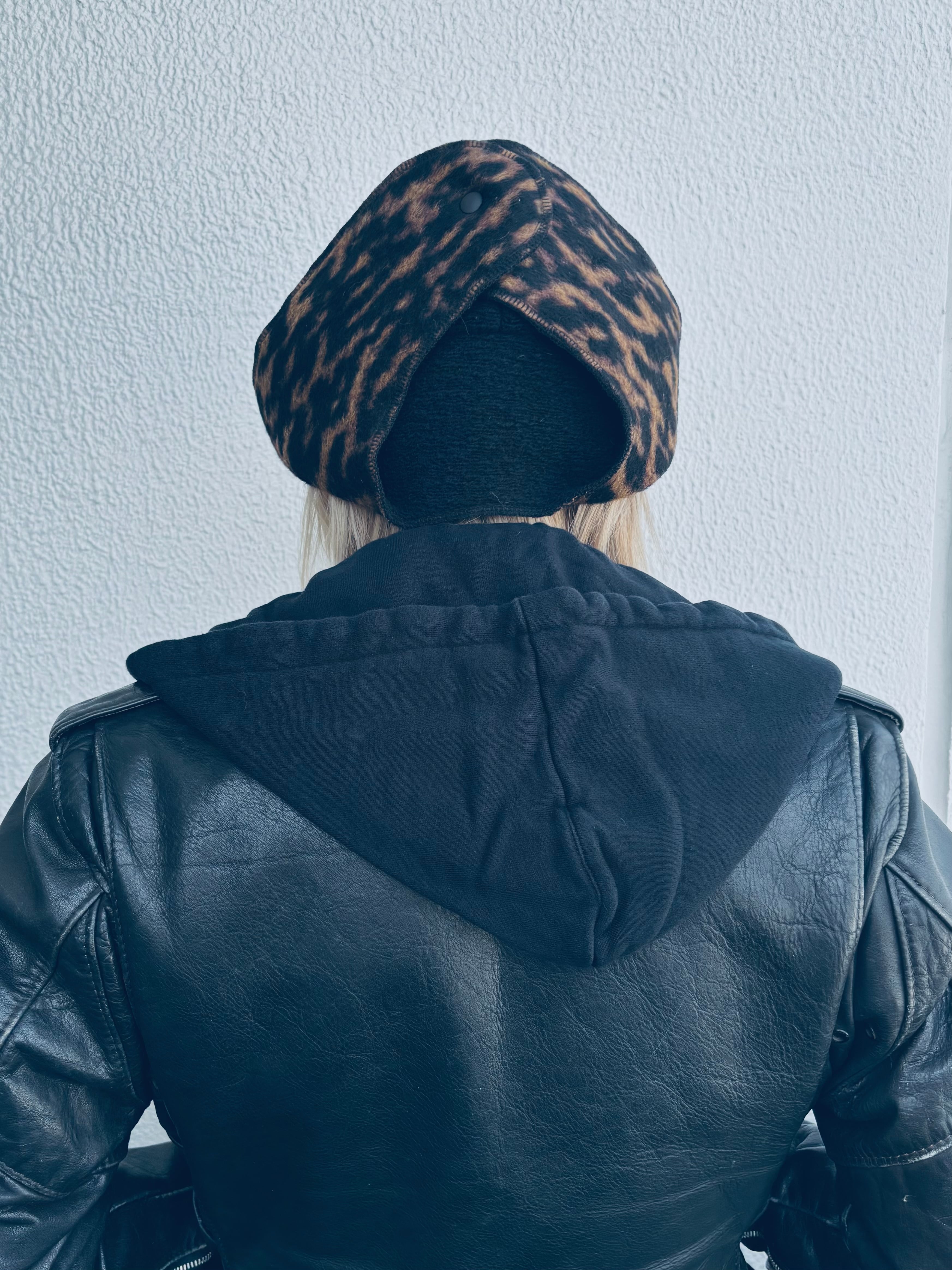 耳当て裏部分にはチラッとジャガード織レオパードを使用し、カートのスタイリングも意識。
